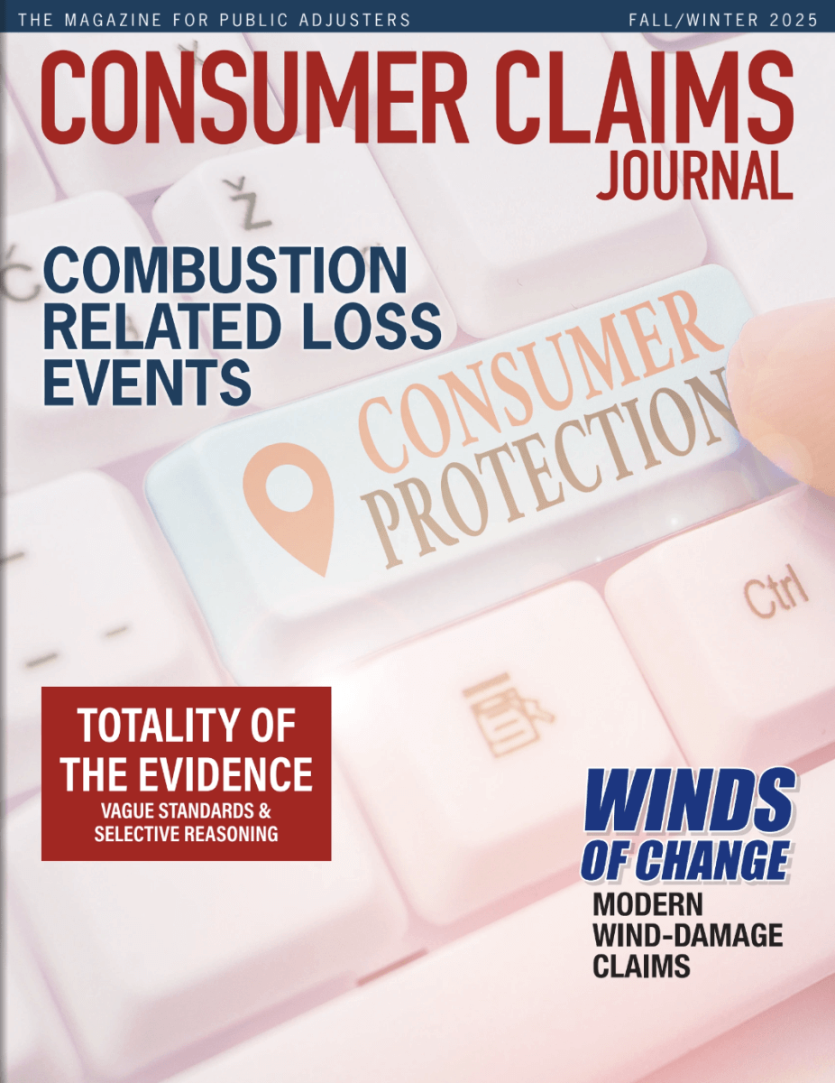 Consumer Claims Journal is a magazine that contains first-party property insurance-related articles; reporting on state legislative and regulatory matters; current cases of interest to adjusters and attorneys; information on important products and services used by insurance professionals, association industry news (including a calendar of events), and more.
